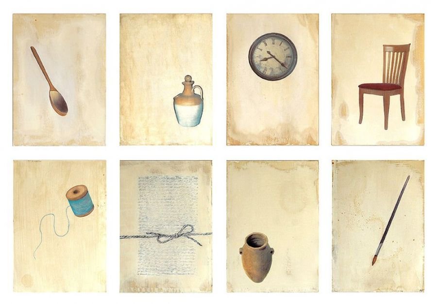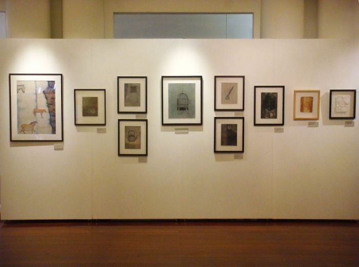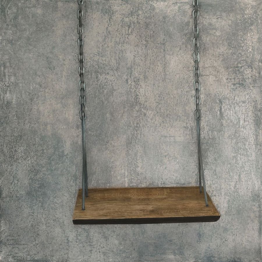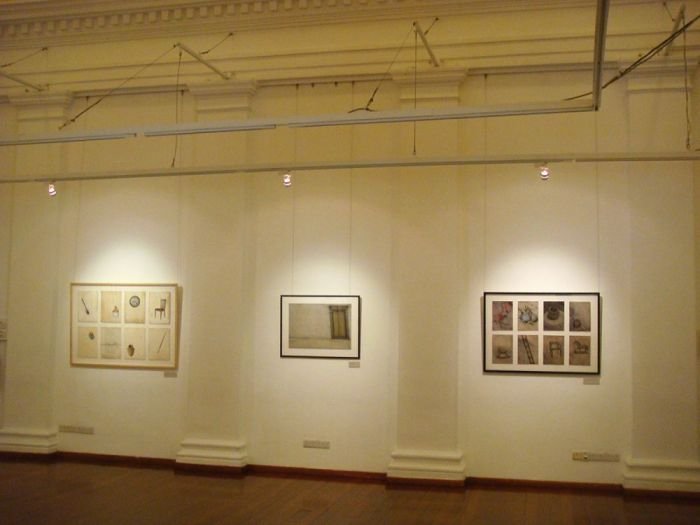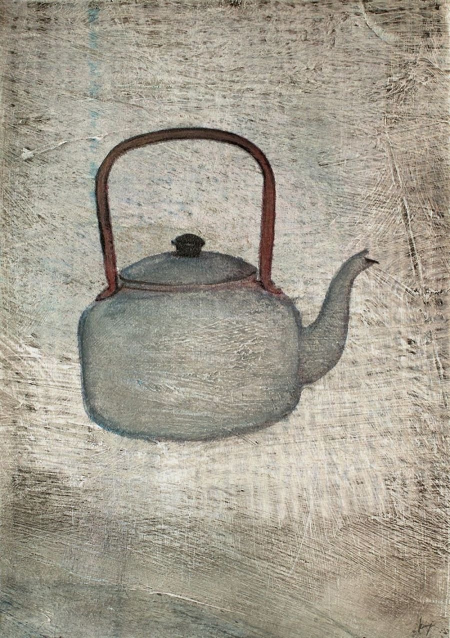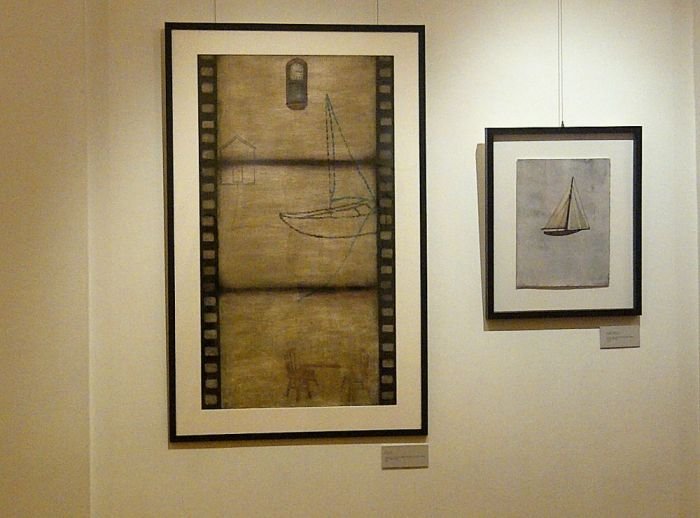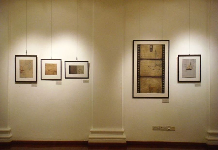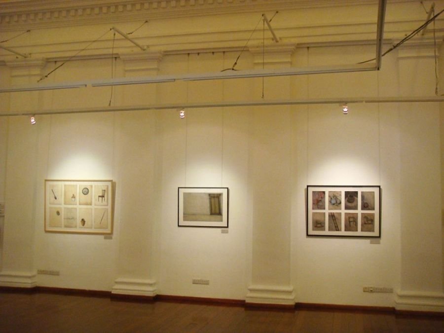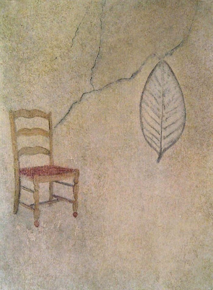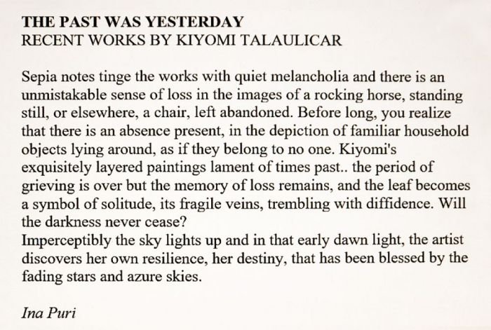 Sepia notes tinge the works with quiet melancholia and there is an unmistakable sense of loss in the images of a rocking horse, standing still, or elsewhere, a chair, left abandoned. Before long, you realize that there is an absence present, in the depiction of familiar household objects lying around, as if they belong to no one. Kiyomi's exquisitely layered paintings lament of times past.. the period of grieving is over but the memory of loss remains, and the leaf becomes a symbol of solitude, its fragile veins, trembling with diffidence. Will the darkness never cease?