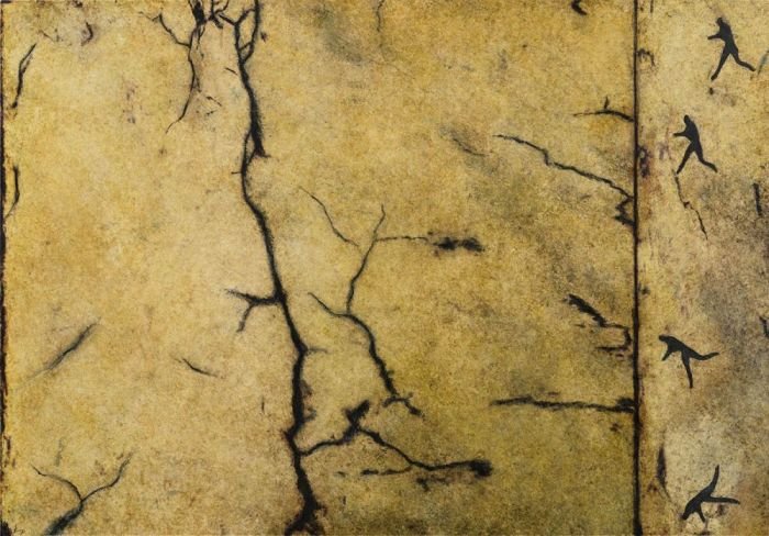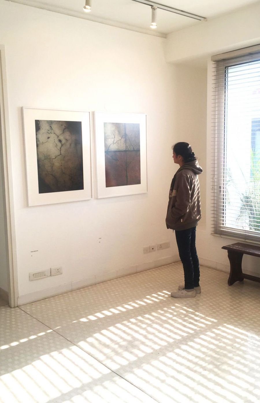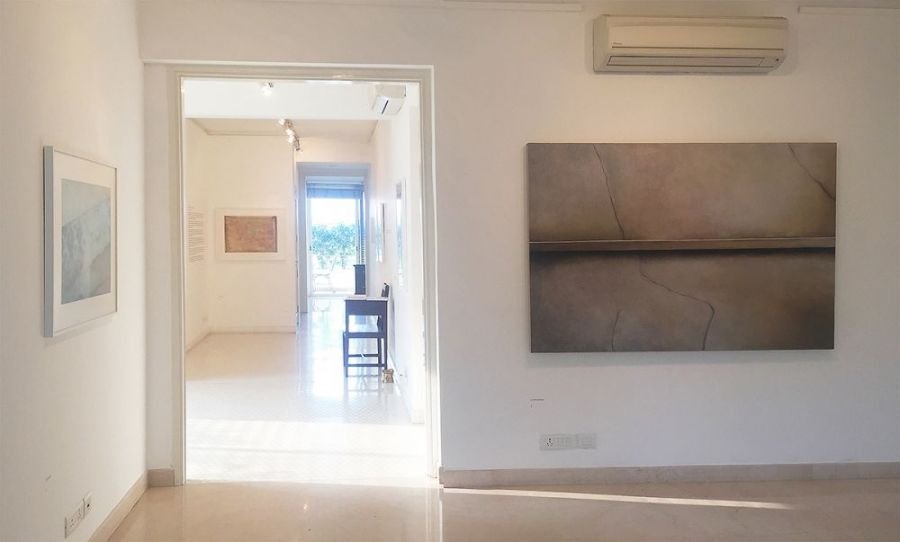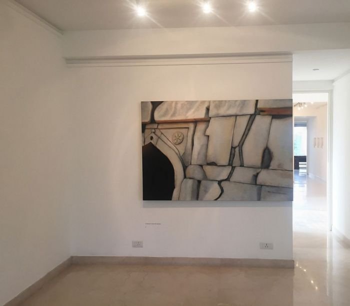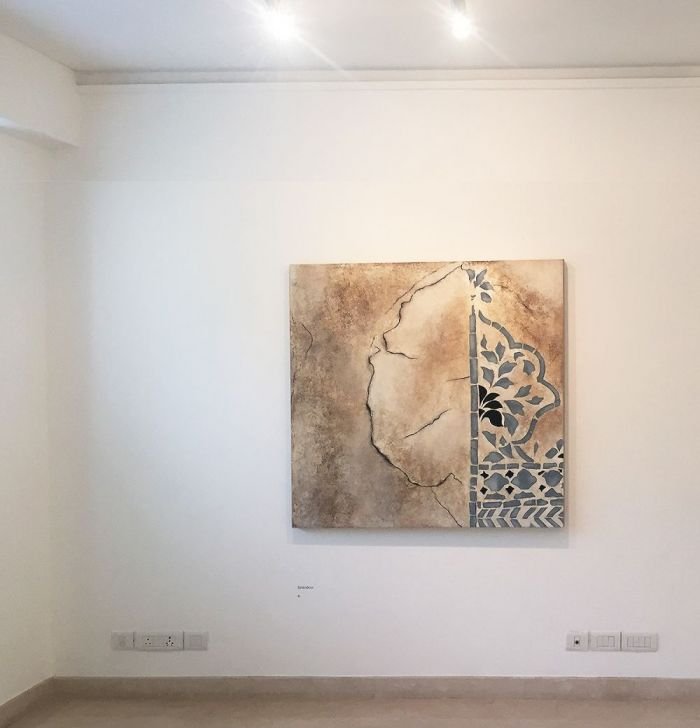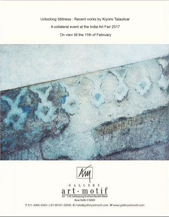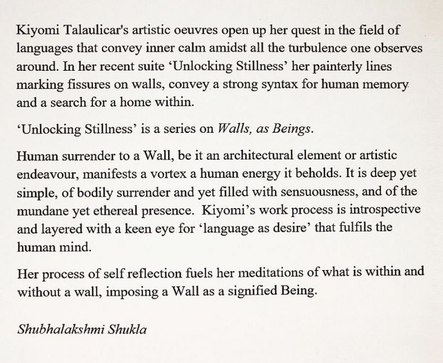 Kiyomi Talaulicar's artistic oeuvres open up her quest in the field of languages that convey inner calm amidst all the turbulence one observes around. In her recent suite ‘Unlocking Stillness’ her painterly lines marking fissures on walls, convey a strong syntax for human memory and a search for a home within. ‘Unlocking Stillness’ is a series on Walls, as Beings.
