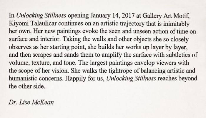 In Unlocking Stillness opening January 14, 2017 at Gallery Art Motif, Kiyomi Talaulicar continues on an artistic trajectory that is inimitably her own. Her new paintings evoke the seen and unseen action of time on surface and interior. Taking the walls and other objects she so closely observes as her starting point, she builds her works up layer by layer, and then scrapes and sands them to amplify the surface with subtleties of volume, texture, and tone. The largest paintings envelop viewers with the scope of her vision. She walks the tightrope of balancing artistic and humanistic concerns. Happily for us, Unlocking Stillness reaches beyond the other side.