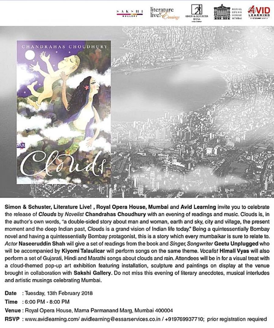 Celebrating the release of the book 'Clouds' by novelist Chandrahas Choudhury, an event of literature, art & music celebrating the theme of Clouds, organized by Simon & Schuster, Literature Live!, Royal Opera House Mumbai & Avid Learning